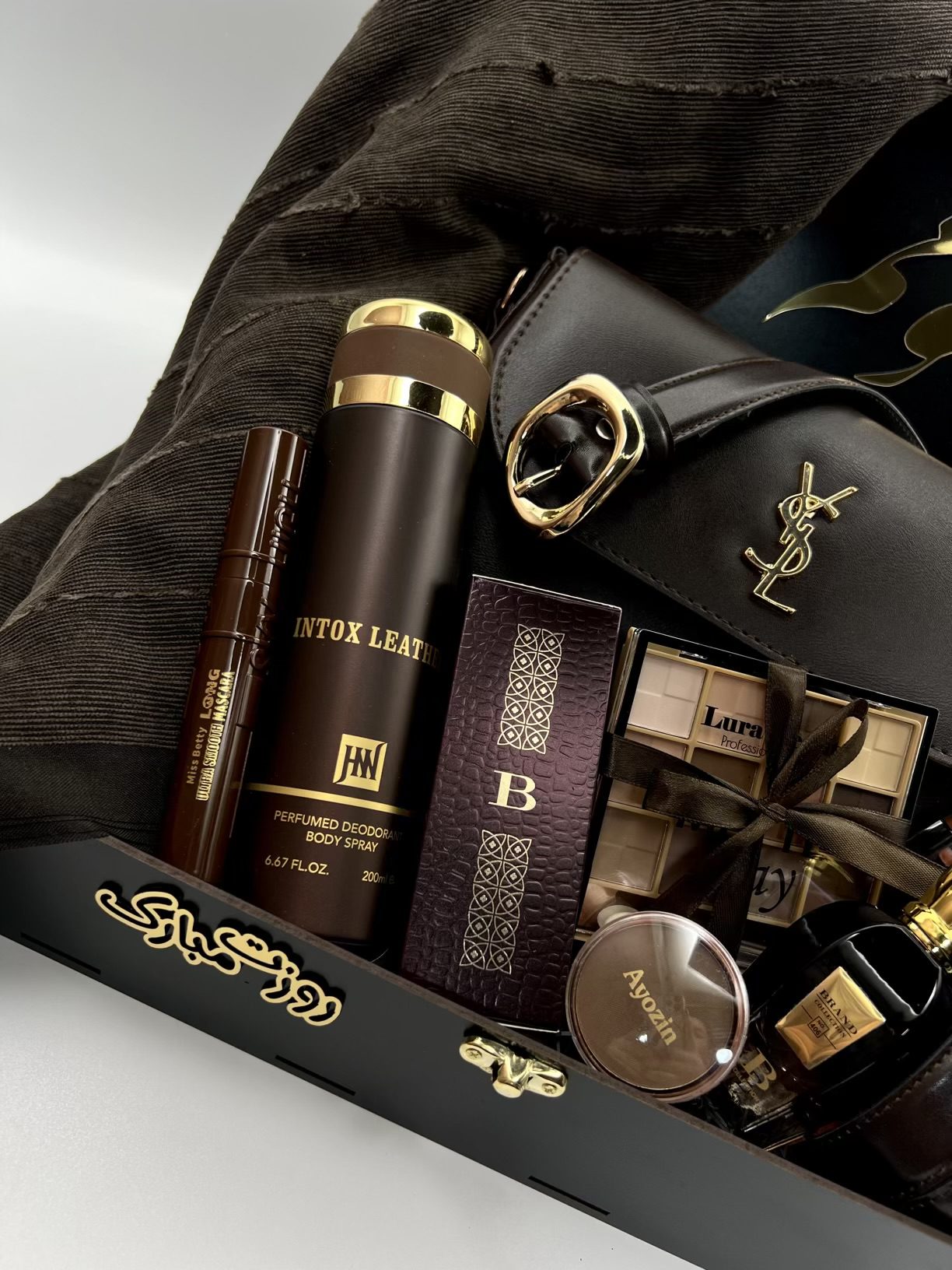 كيف شيك و زيبا به همراه كمربند ست،شال مخملی، ادکلن عماراتی با رایحه فوق العاده شیک و ماندگاری بالا، اسپری عماراتی، پلت سایه با پیگمنت عالی، ریمل قهوه ای، تینت لب قهوه ای، رژ گونه، باکس چوبی به همراه تایپوگرافی🤩