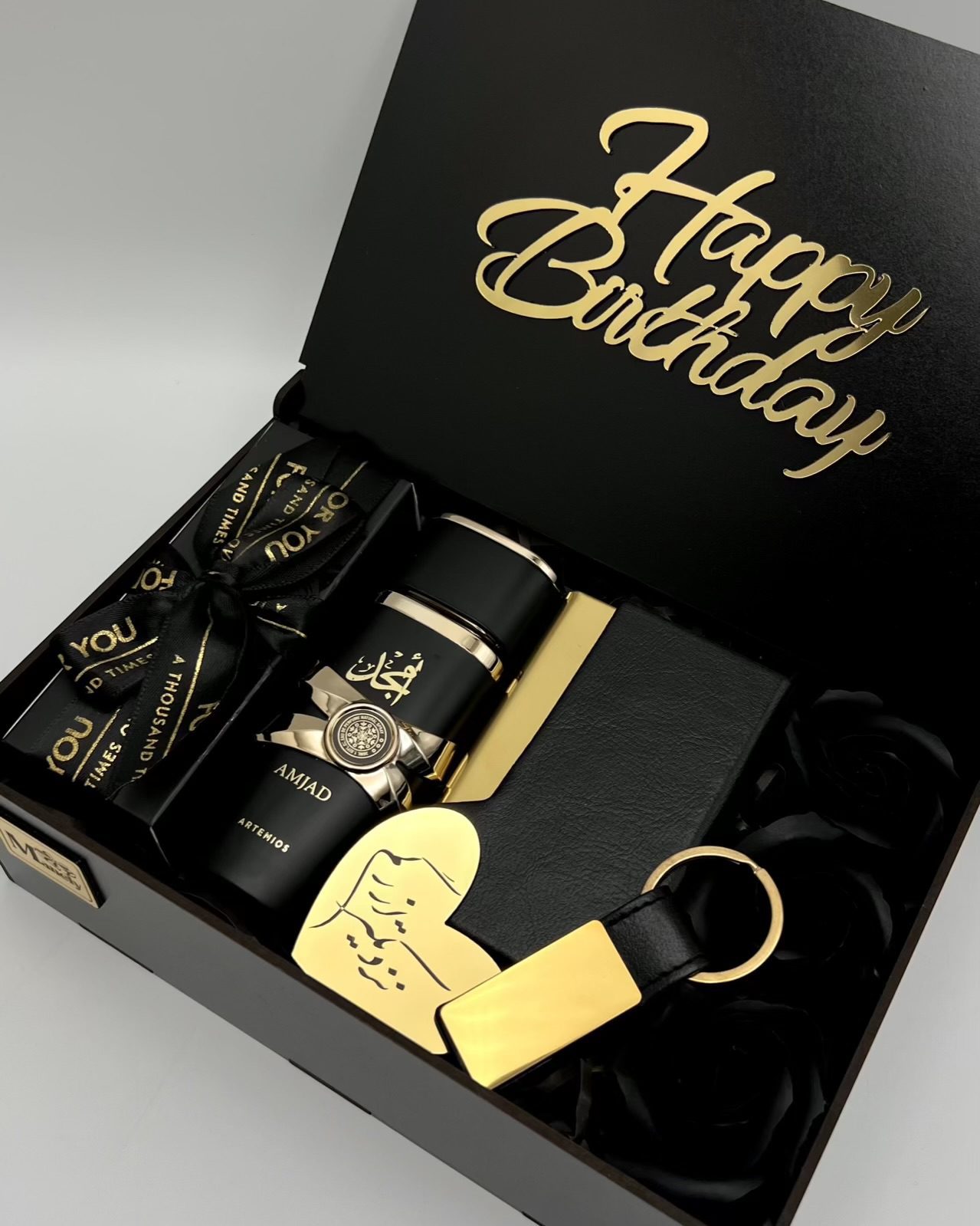 ادكلن ٥٠ ميل عماراتي با رايحه فوق العاده بينظير و ماندگاری عالی، جاکارتی مگنتی استیل با روکش چرم ، سرکلیدی چرم با پلاک استیل، سه شاخه گل رز معطر، جعبه چوبی تایپوگرافی همراه با بسته بندی شیک و کادویی♥️