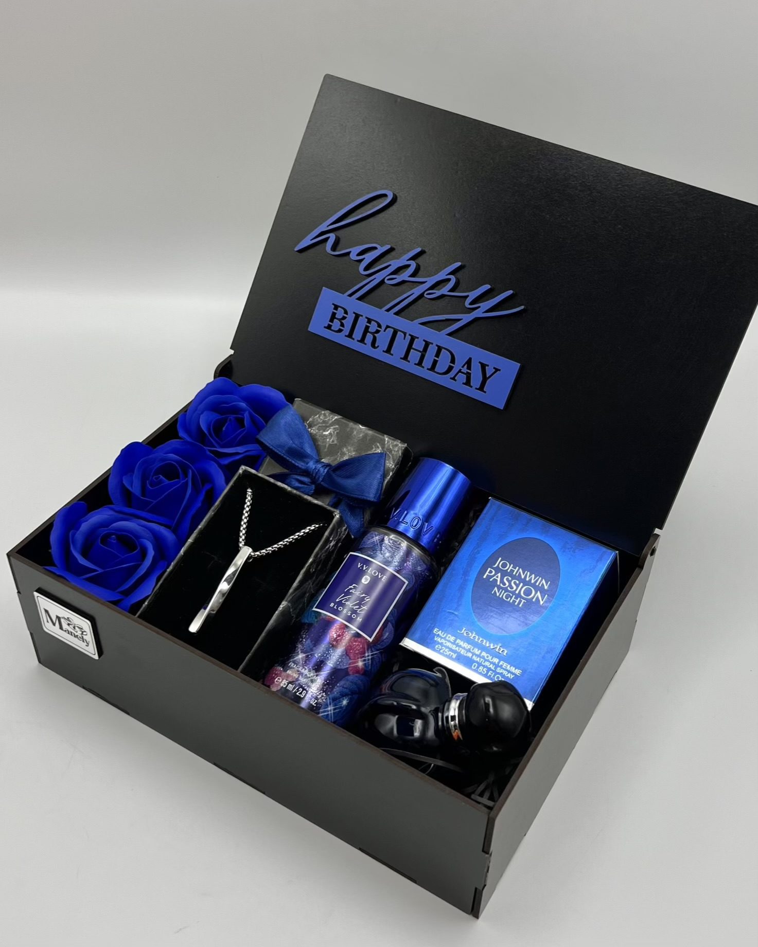 ادکلن عماراتی با ماندگاری و رایحه ی بینظیر، گردنبند پیچ استیل رنگ ثابت،بادی اسپلش با رایحه عالی، سه شاخه گل رز معطر، جعبه چوبی صندوقی همراه با تایپوگرافی🤩💙